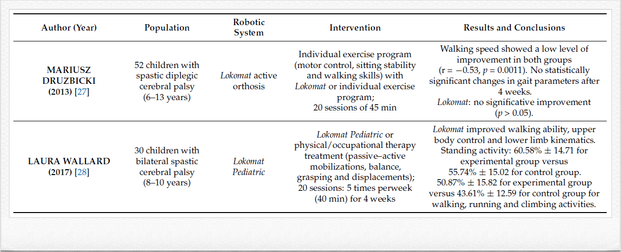 Wallard et al. demonstrated an improvement in gait in their two studies, which improved upper limb control, as well as producing better postural control and an improved gait pattern. Druzbicki et al. concluded that the Lokomat, despite producing a slight improvement in gait, did not provide a significant improvement in the sample parameters after 4 weeks of treatment. Finally, Petrarca et al. postulated that they had inconclusive results after the implementation of a 4-week treatment program with Lokomat and hysiotherapy and that the results were not conclusive. Yasar et al. stated that there was no difference between the two treatment groups, but both groups improved in functional independence, balance and gait with the established treatment.